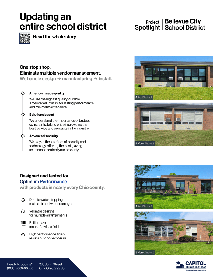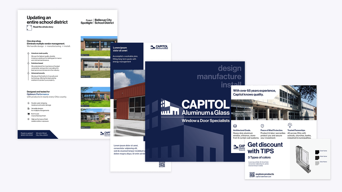 I created several Project Spotlights highlighting past work designed for specific environments like schools with priorities around security, durability, and low maintenance through winter break and summer months, alongside broader prints with more universal appeal, as well as general leaflets promoting all of what Capitol does.