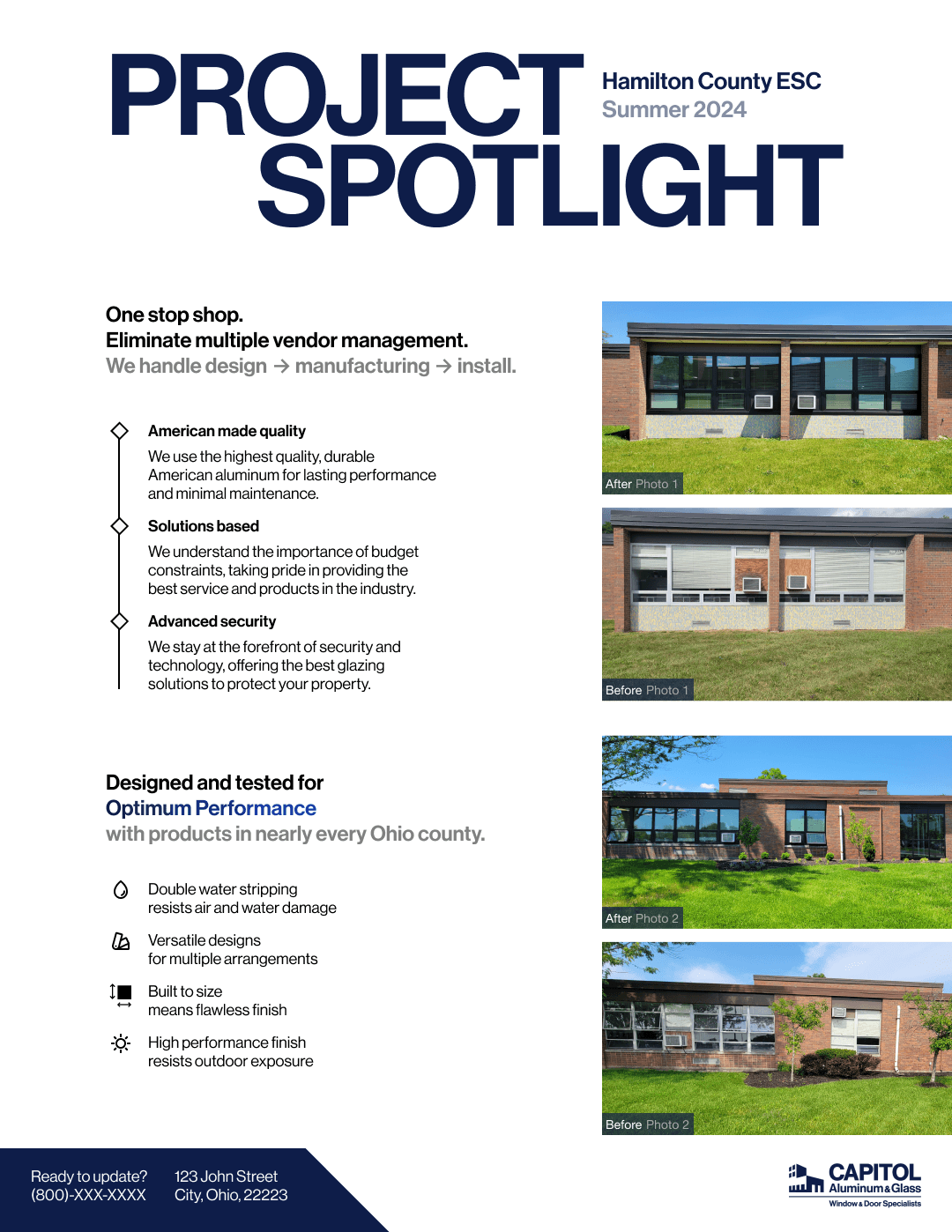We created several Project Spotlights highlighting past work designed for specific environments like schools with priorities around security, durability, and low maintenance through winter break and summer months, alongside broader prints with more universal appeal.